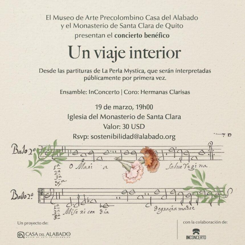 “Un viaje interior” presentará por primera vez partituras del manuscrito histórico La Perla Mystica El patrimonio cultural de Quito será protagonista de un concierto especial que busca rescatar y difundir música histórica del período colonial. El Museo de Arte Precolombino Casa del Alabado, el Monasterio de Santa Clara y la agrupación InConcerto presentarán el concierto benéfico “Un viaje interior”, una…