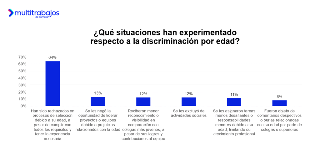 ¿Qué tipo de discriminación por edad experimentaron? El 64% dice haber sido rechazado en procesos de selección, a pesar de cumplir con todos los requisitos y tener la experiencia necesaria para el puesto; el 13% indica que se le negó la oportunidad de liderar proyectos o equipos debido a prejuicios relacionados con la edad; el 12% señala haber recibido menor reconocimiento o visibilidad en comparación con colegas más jóvenes; y otro 12% menciona que se les excluyó de actividades sociales.