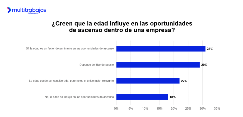 En cuanto a las oportunidades de ascenso dentro de la organización, el 31% de los talentos cree que la edad influye dependiendo del tipo de puesto; el 29% sí cree que es un factor determinante en las oportunidades de ascenso; el 18% indica que la edad puede ser considerada, pero no es el único factor relevante; mientras que el 22% señala que la edad no influye.