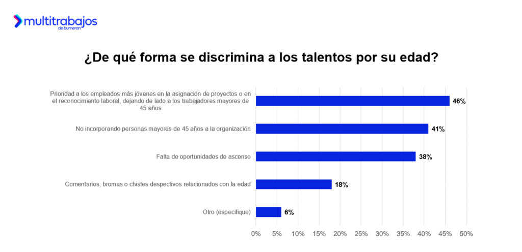 El 46% menciona que se prioriza a los empleados más jóvenes en la asignación de proyectos o en el reconocimiento laboral; el 41% indica que no se incorporan personas mayores de 45 años a la organización y el 38% señala la falta de oportunidades de ascenso.