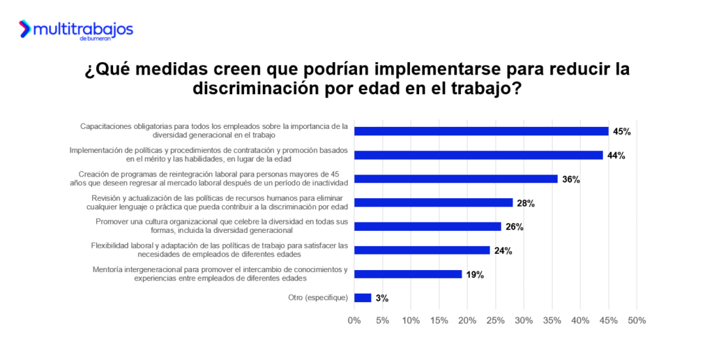 El 45% de los talentos sugiere capacitaciones obligatorias para todos los talentos sobre la importancia de la diversidad generacional en el trabajo; el 44% propone la implementación de políticas y procedimientos de contratación y promoción basados en el mérito y las habilidades, en lugar de la edad; y el 36% menciona la creación de programas de reintegración laboral para personas mayores de 45 años que deseen volver al mercado laboral después de un período de inactividad.