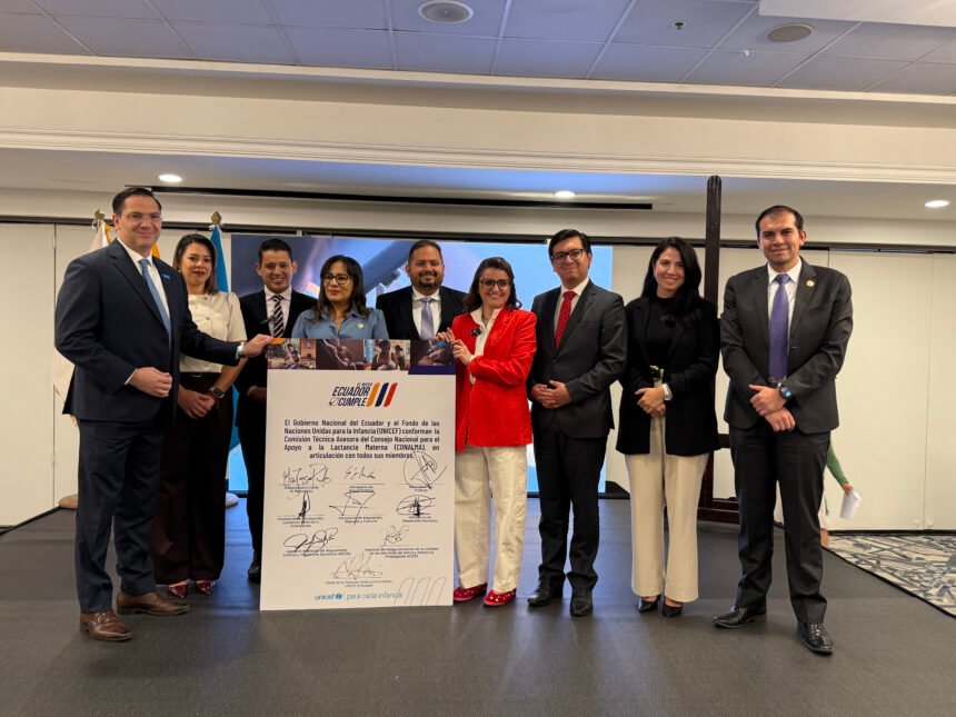 Durante la ceremonia, las autoridades de la Vicepresidencia de Ecuador, UNICEF y varios ministerios, junto con la Agencia Nacional de Regulación, Control y Vigilancia Sanitaria (ARCSA) y la Agencia de Aseguramiento de la Calidad de los Servicios de Salud y Medicina Prepagada (ACESS), firmaron un compromiso para fortalecer la lactancia materna y establecer sistemas sostenibles de apoyo para las madres y sus familias.