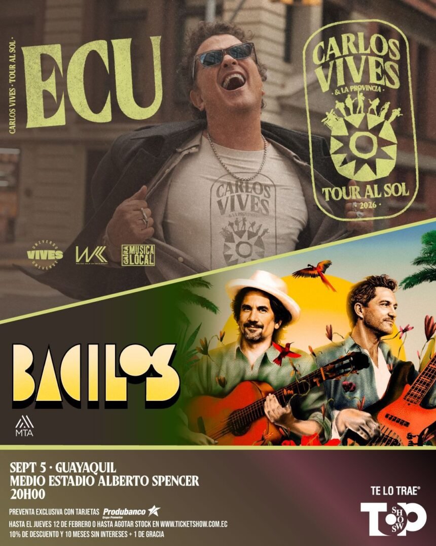 GUAYAQUIL PREPÁRATE PARA LA FIESTA MÁS GRANDE DE TU VIDA UNA SOLA NOCHE CARLOS VIVES “TOUR AL SOL 2026” & BACILOS GUAYAQUIL – MEDIO ESTADIO ALBERTO SPENCER COLISEO GENERAL RUMIÑAHUI COLISEO JEFFERSON PÉREZ SÁBADO 5 DE SEPTIEMBRE 20H00